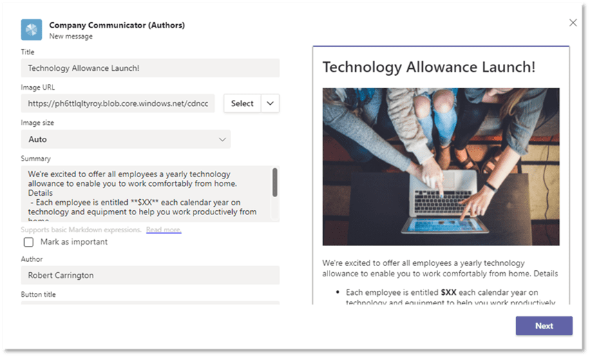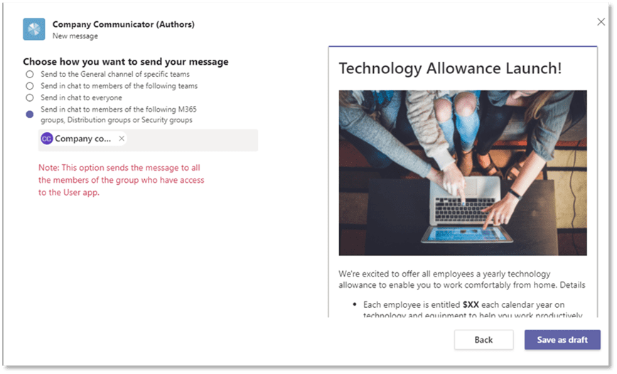 Once deployed, you can easily create messages by using a team tab where team members who are permissioned can collaborate, create, preview, and send messages.