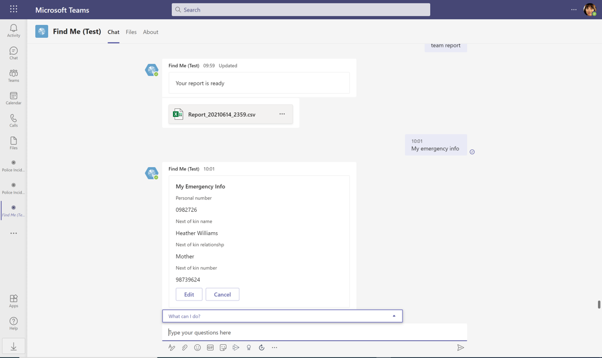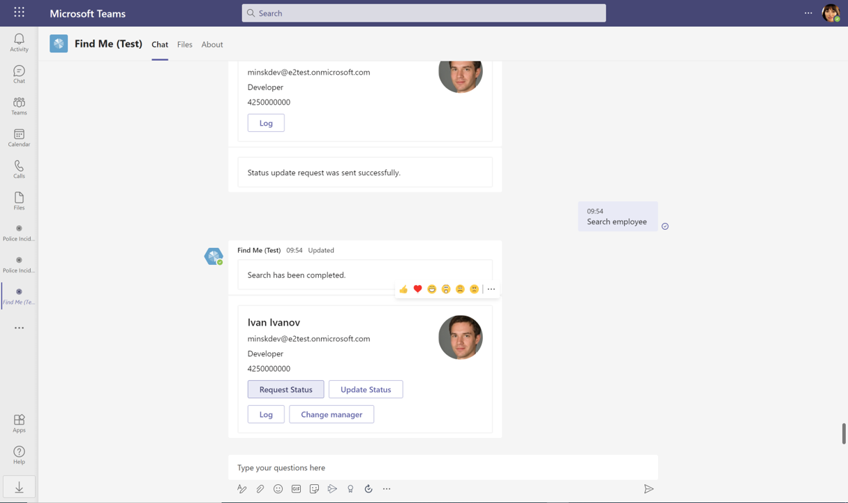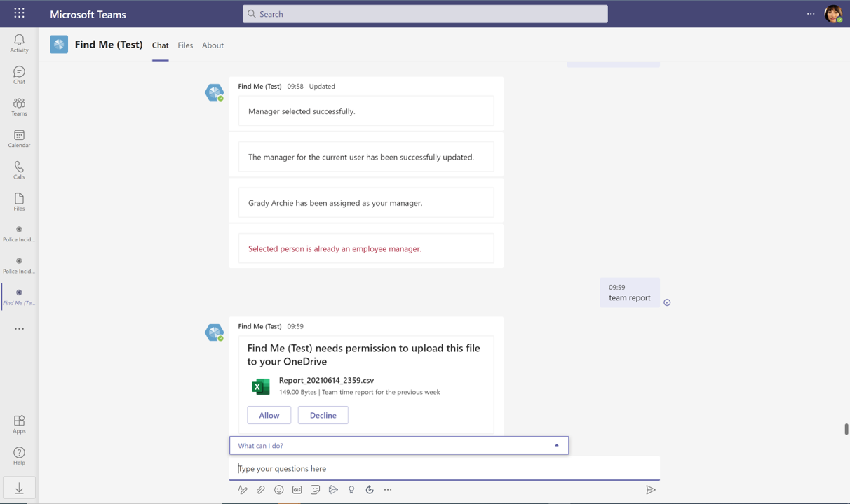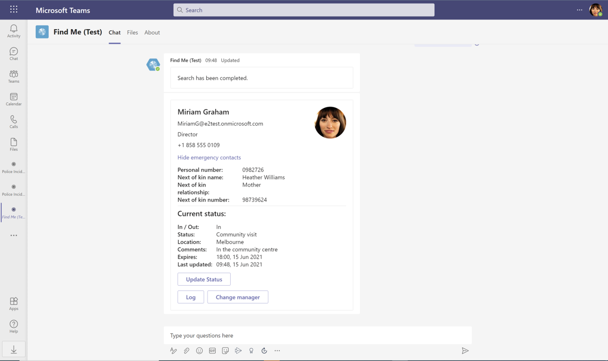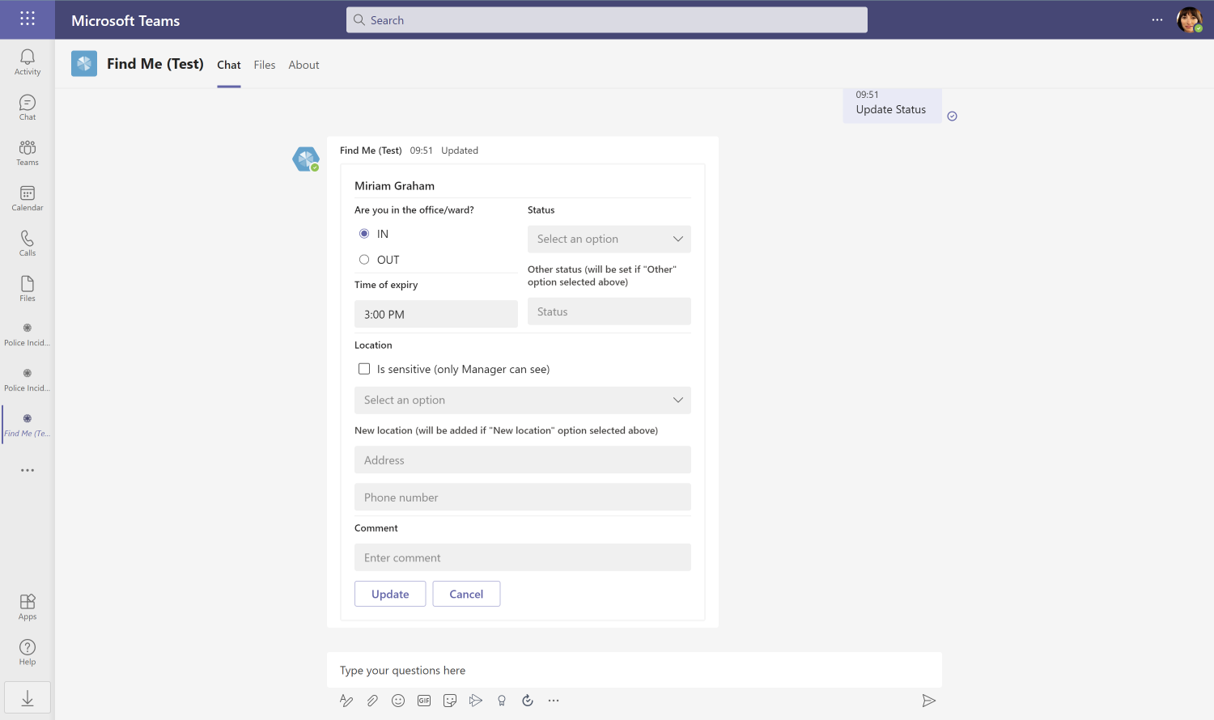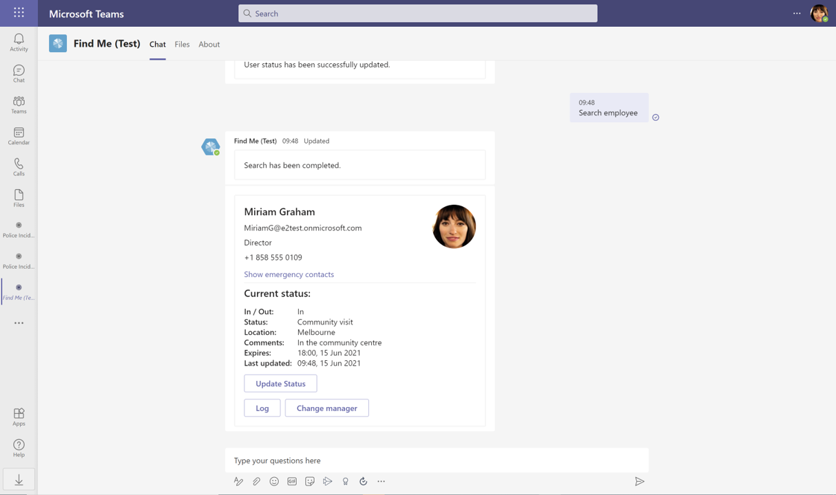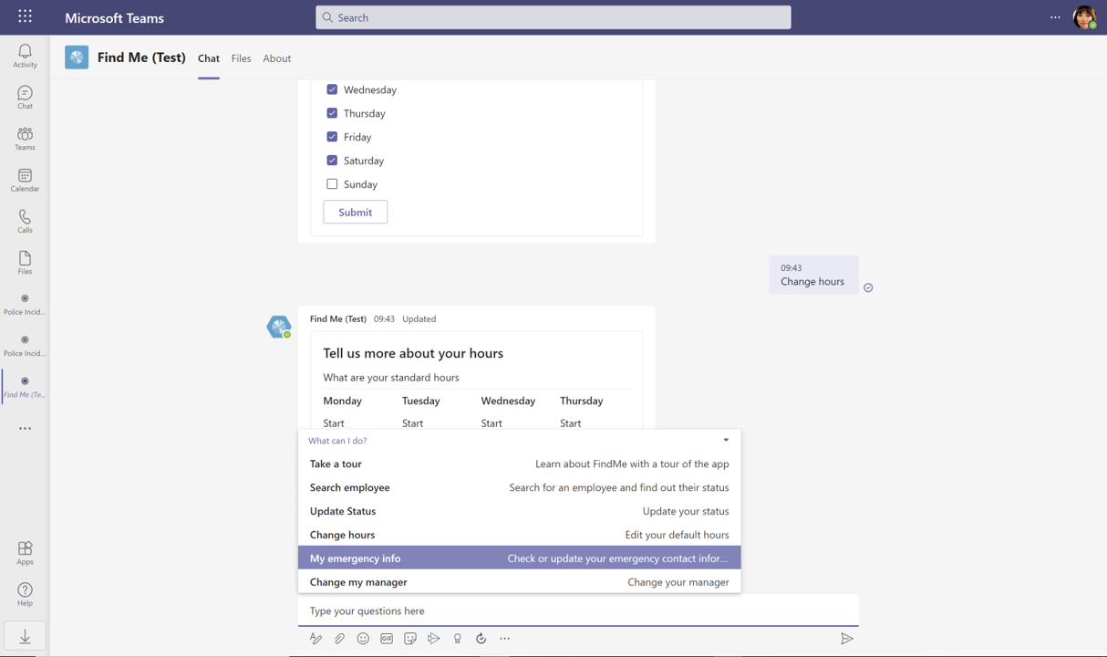 Once installed, the app will then uses the MS Teams chat function where users can interact with the FindMe bot to carry out the main functions of the app via interactive cards. To activate these cards, you simply type the suggested actions directly into the chat box. This will give present options for you to (e.g. search for an employee or change working hours), which will then trigger the card you need to complete your actions.