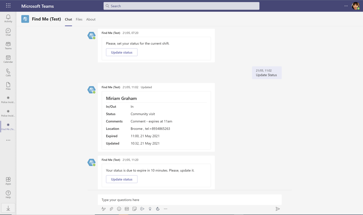 Built for Microsoft Teams, the Find Me App helps you to track job locations and time frames of field workers when they’re not in the office, while also enabling everyone on the team to manage and share current statuses. It also lets you build reports to track and analyse trends and work patterns so you and your staff can move to better ways of working.
