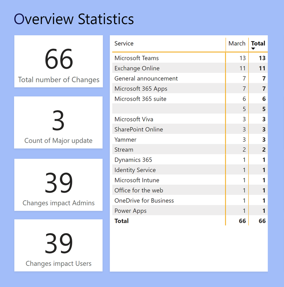 Across March so far, we have seen overall of 66 updates or changes to the M365 stack, 3 major updates, 39 of which affected admins and 39 affected users.