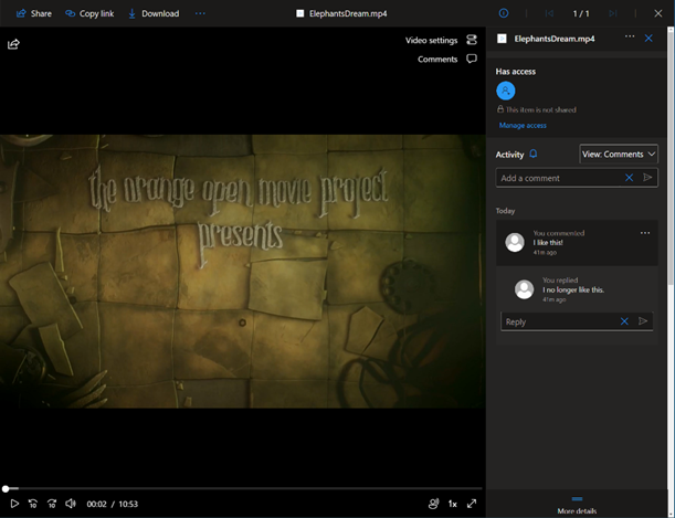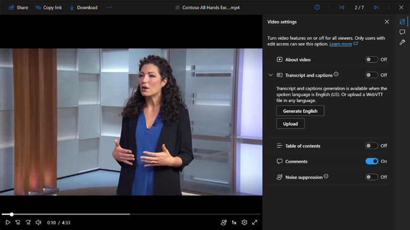This new functionality builds on top of the already existing comments found in OneDrive and SharePoint Online but presents these comments with a new Office look and feel within the player. It also allows users with view permissions to leave a comment, which is a default change in behaviour in terms of permissions for video and audio files.