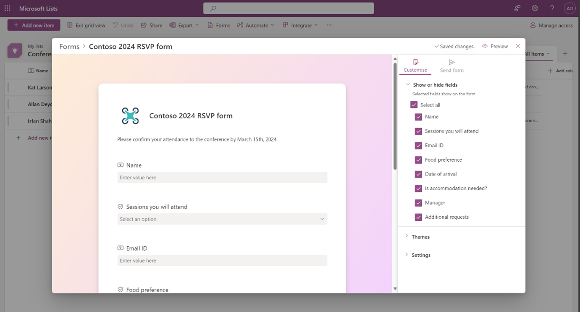 A visual refresh will be coming soon to Microsoft Lists in SharePoint Online. Users can expect a clean user interface that is easy to design, easily shared, and respondents are able to fill them out on any device. Additionally, all form responses appear immediately in your list after recipient clicks the submit button.