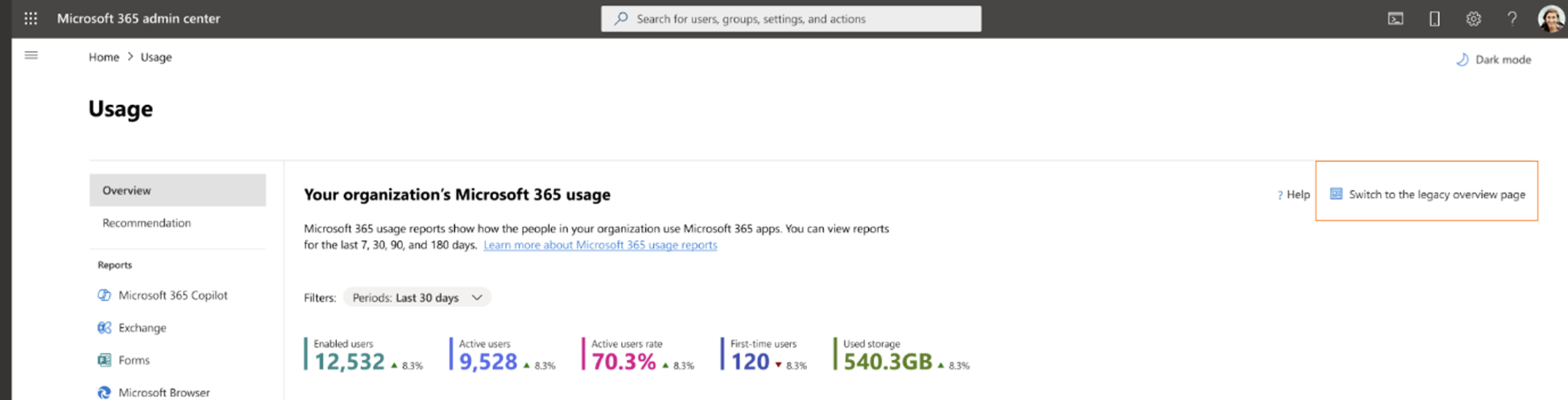 The Microsoft 365 Admin Centre’s “Usage report” overview page will be redesigned to provide a better overview of key metrics such as enabled and active users, user state compositions (e.g. first time, returning users), storage by product, and key usage metrics for Microsoft 365 apps.