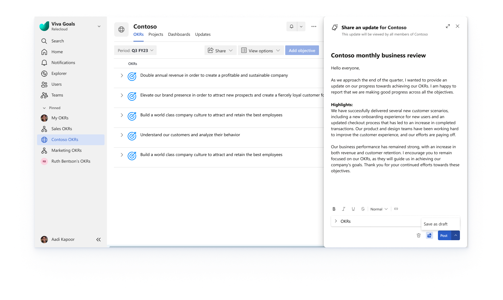 The ‘Share an Update’ feature will allow leaders to share updates of their team goals to the members of their organisation directly from Viva Goals. Updates are sent to users via email.
