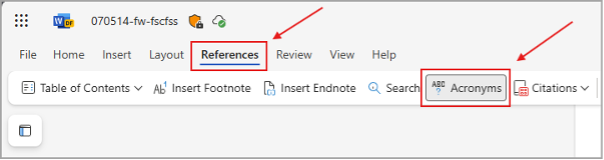 Retirement of this feature is scheduled for 11 September 2024. After this day, users will not be able to access the feature from the References tab on the ribbon or from the Acronyms section in the Editor pane on the right of the screen.