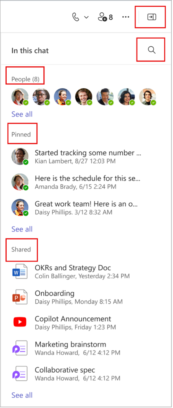 With this update, users of Teams Chat will have access to contextual information including members, pinned messages, shared files and links, and entry point to contextual search within the chat window.