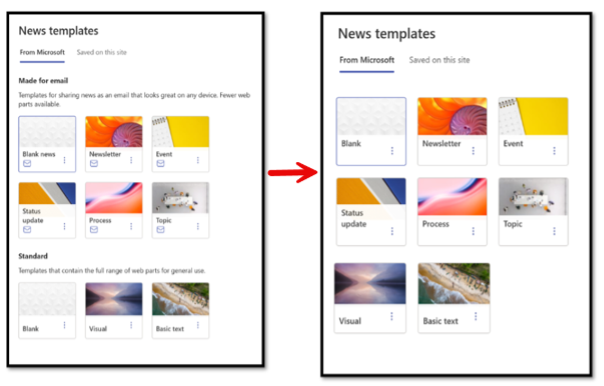 Microsoft SharePoint is updating News templates to be simpler and support email sharing by default. When creating a new News post, all templates will be grouped, and News authors will no longer need to select from a specific email-ready category. When sharing SharePoint News posts, they will have a greater opportunity to share those pages as a fully rendered email instead of sharing as articles as links.