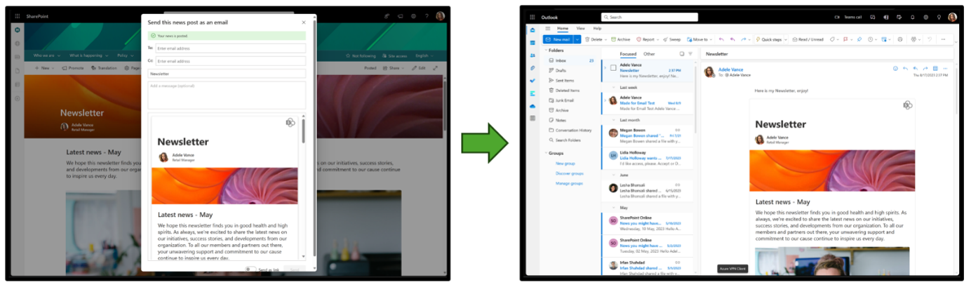 This update makes page templates email-friendly and ready to send without SharePoint News authors needing to worry about page rendering on different devices and via Outlook.