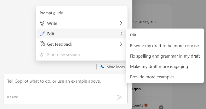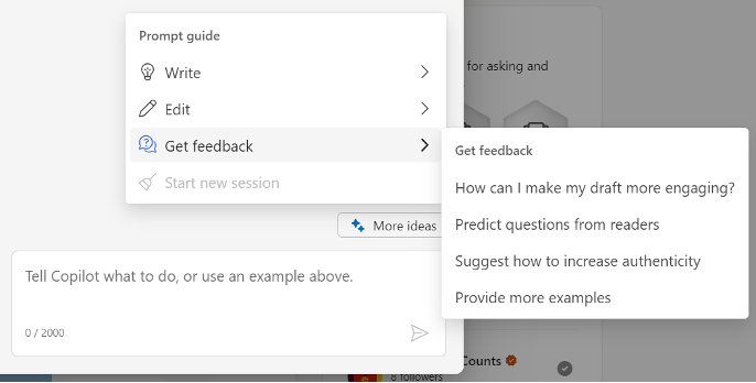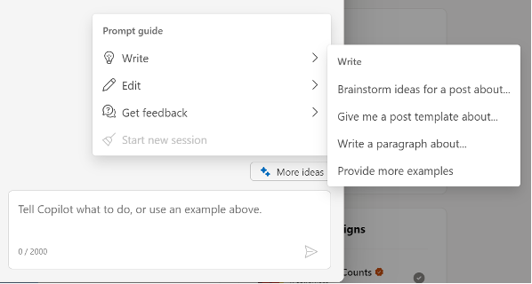 Write – Stuck on an idea? Copilot can assist in brainstorming an idea for a post, provide a template or extend your existing post and write an additional paragraph.