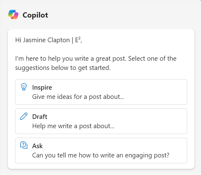 After selecting the Copilot button in Viva Engage, when drafting a post, you are provided a series of buttons to provide you with assistance in content creation.