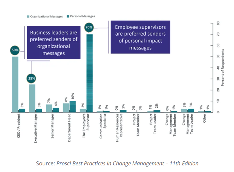 Once you’ve crafted the WIIFM messaging in consultation with your UWG, you’ll need to consider how your different groups will engage with what you’re trying to say. Typically, you can expect office-based employees to regularly check emails or attend virtual meetings, frequent corridors and view news articles posted online. Whereas FLWs may not be tied to a PC, potentially only checking emails once or twice a shift – or even less frequently, jumping onto devices only when a need arises. Prosci states that employee supervisors are the preferred senders of personal impact messages (Ball, et al., 2020). Consider how you can engage your people leaders to drive change on the ground with FLW’s. How can they help get the messaging out to these individuals, in a way that aligns to the way they work?
