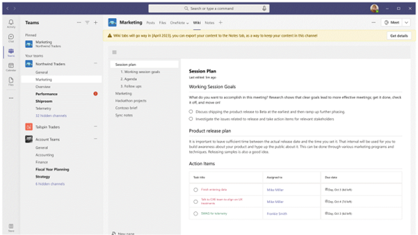 OneNote provides a richer text formatting and more uniform, user, collaboration, and search experience consistent across the Microsoft 365 platform. To export all your current Wikis to OneNote, refer to Microsoft’s documentation here. Note that new channels will automatically come with a OneNote notebook.