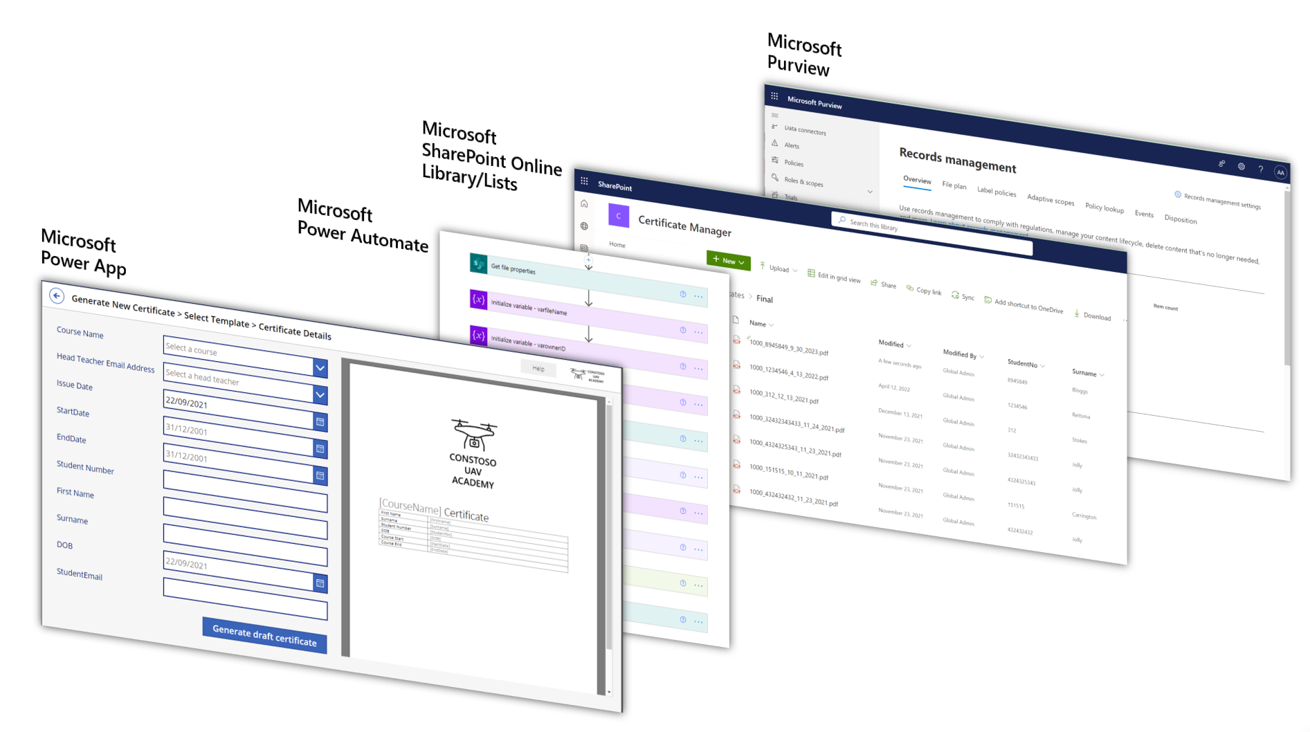 Depending on your solution you may have ‘document’ outputs, or data output to list items or other data stores such as Dataverse. If your app is outputting documents or capturing process data into SharePoint Online, Microsoft Purview provides a great set of capabilities to bring information governance to your apps information. Below is an example of a course certificate generator app: