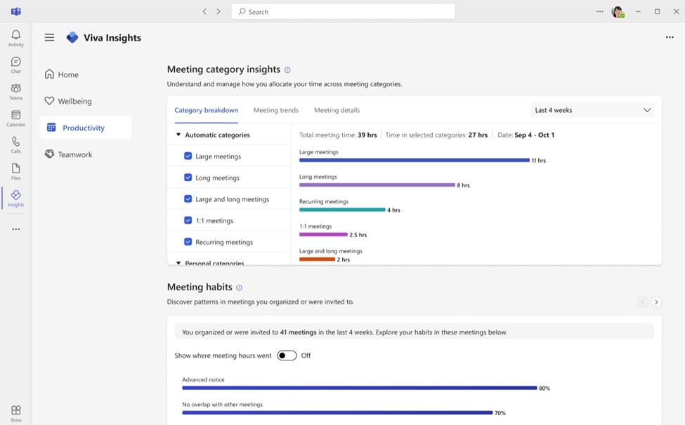 Meeting category insights in the Viva Insights app helps Viva Insights licensed users understand how they are allocating their time across meeting categories. This feature currently uses the categories manually assigned by users in Outlook and Teams, however meeting category insights will soon begin automatically categorising meetings for users based on meeting size, cadence, and number of people in the meetings.