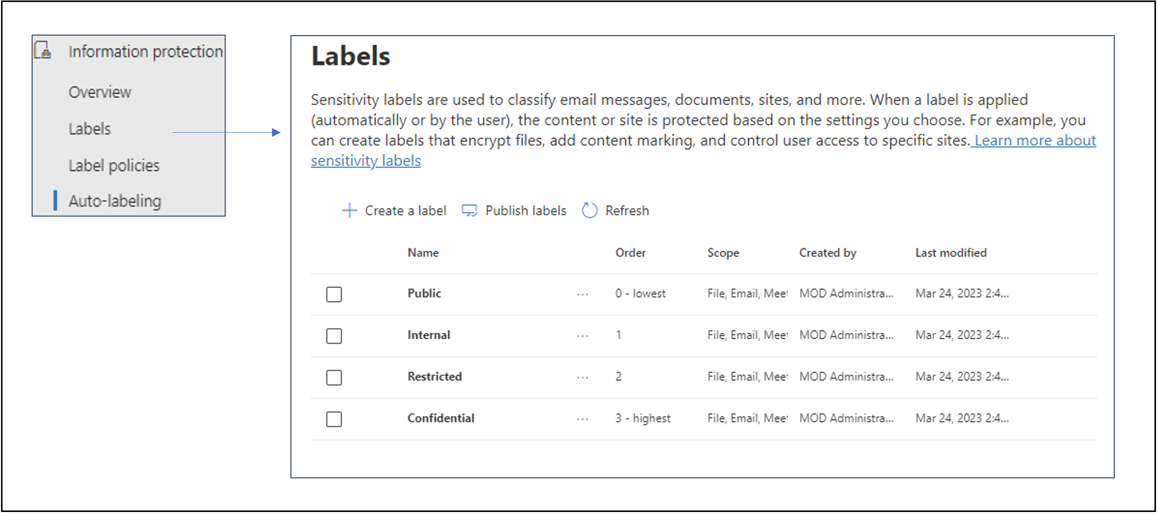 Sensitivity labels can range from fairly basic – simple content marking of documents and emails to more complex – a label that applies encryption to content and restricts access and sharing to a specific set of users. A good way to become familiar with the options is to start by creating one or two labels with simple scope and settings and publish them to a small number of users. Once you are comfortable with the basic options, create more complex labels until you understand the full spectrum of available functionality.