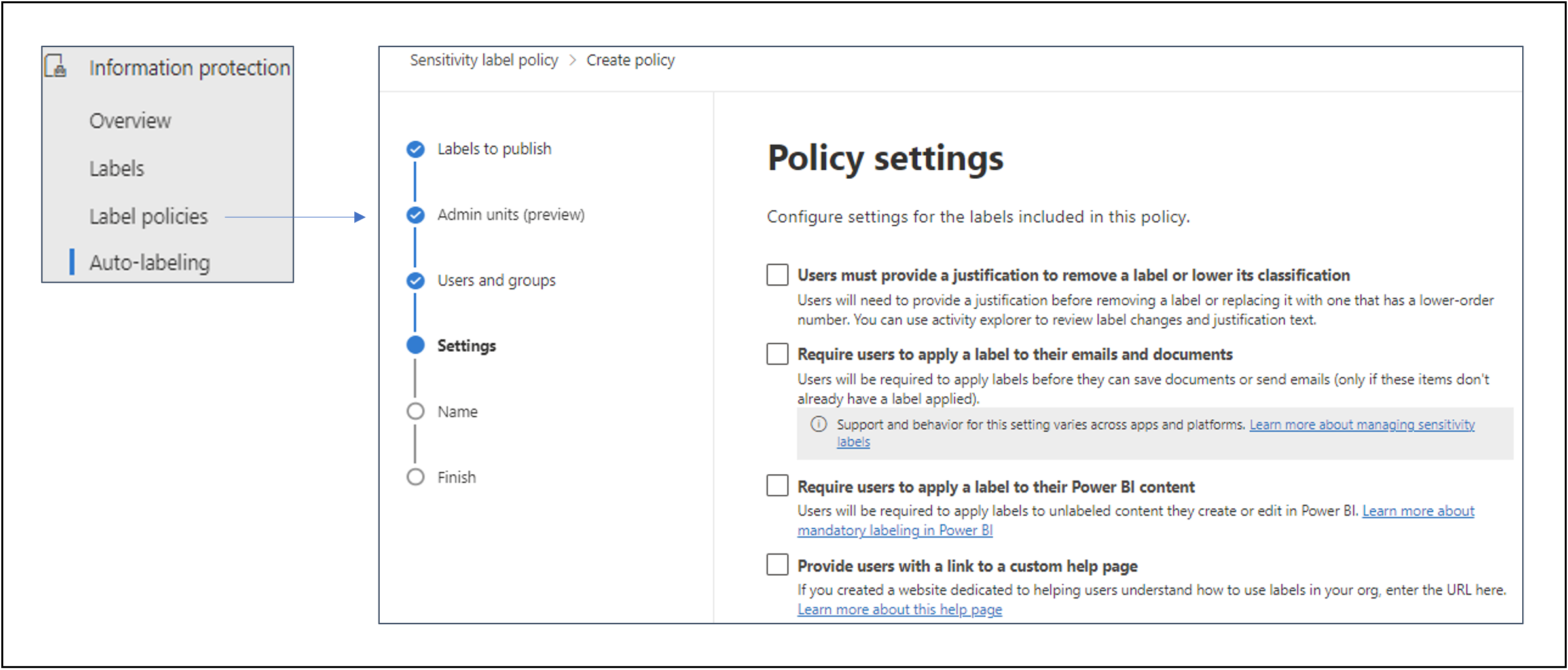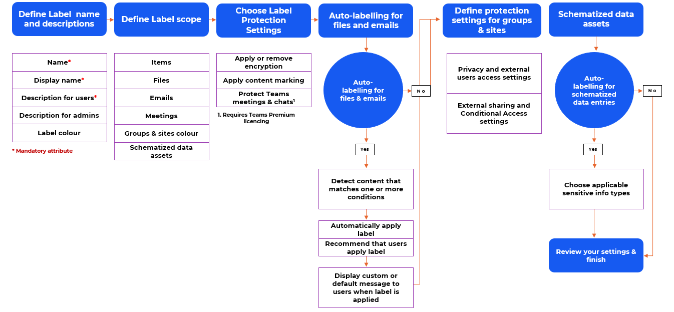 There are a wide range of options available when defining a sensitivity label. The workflow diagram below summarises the steps and options.