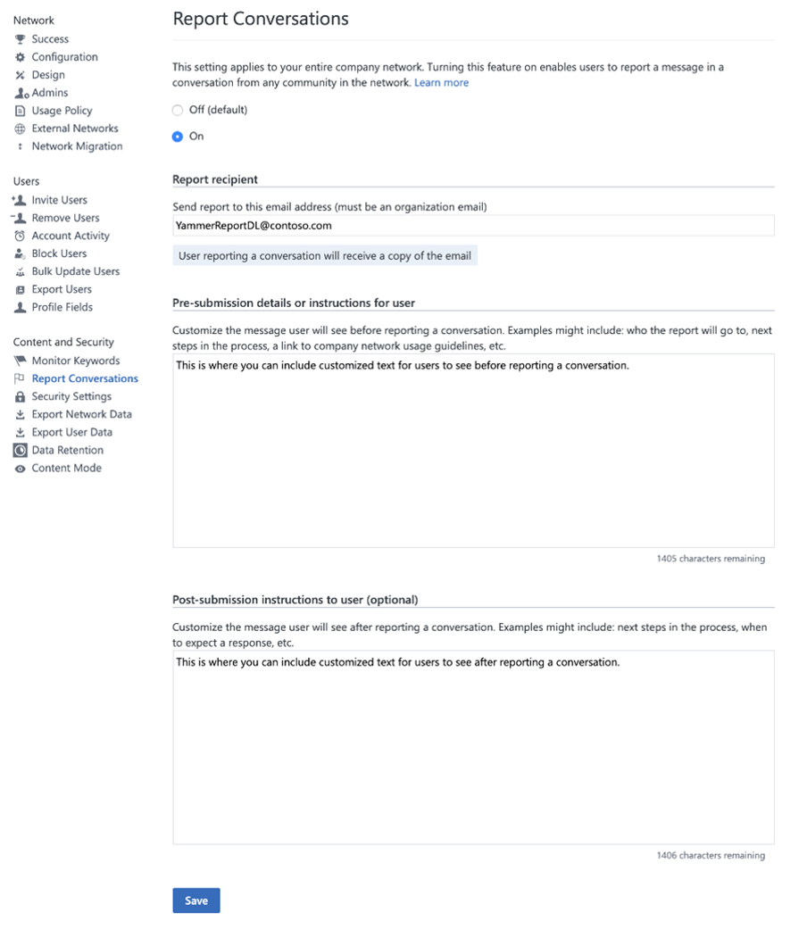 To use this feature, please enable Viva Engage conversation reporting. Reported conversations will automatically route to Communication Compliance if a supported license is present in the tenant. Access the Communication Compliance solution in the Microsoft Purview compliance portal. Learn more on how to create and manage communication compliance policies.