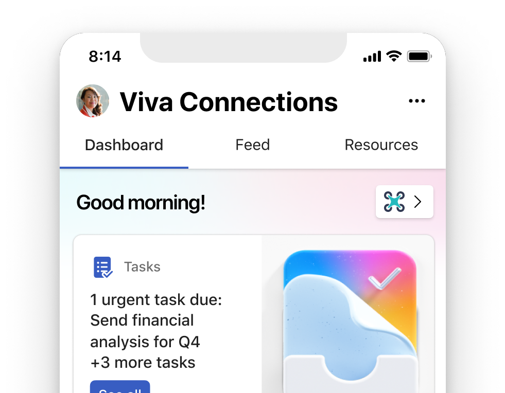 Consistency is key, and with more people than ever using their mobile for work tasks it’s important that key messages are easy to find. The banner image you would have picked for your Viva Connections desktop experience will now appear on mobile. If you have not uploaded an image, users will see a default image.