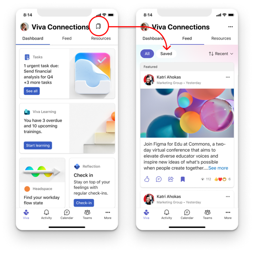 Viva Connections mobile users will soon see a UI change. Your saved links will move from the app title bar into the Feed tab for improved alignment and access.