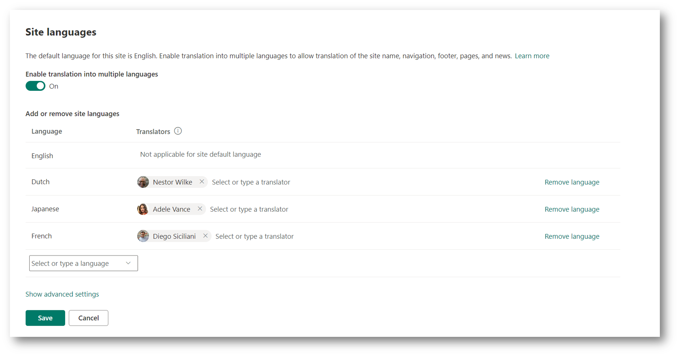 This section is where you can select the various languages that you wish to support. Each language is required to have a nominated translator, who will be primarily responsible for manually translating the site content for that version.