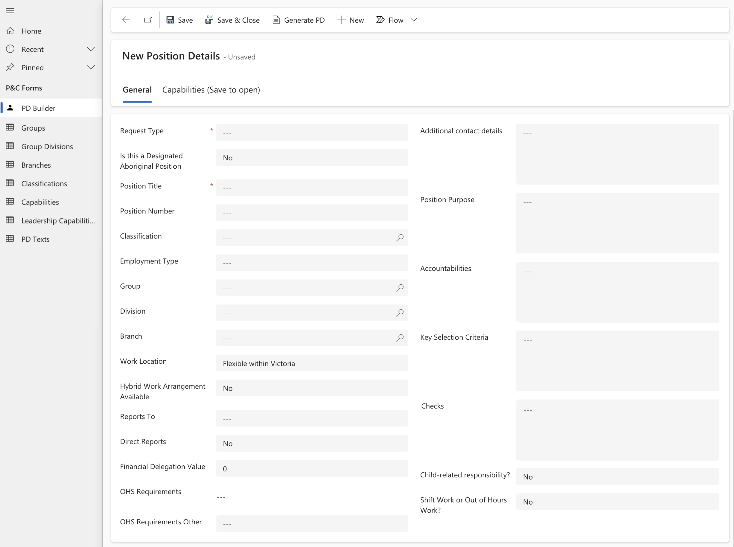 You can use Power Automate in the background and a guided wizard for your users. For instance, you can create a Position Description Builder app with a Power App to guide users through the process of creating job descriptions, making sure they follow organisational standards. When they’re happy, they can generate a document at the touch of a button with Power Automate to fill in a predefined template (i.e. using your own branded Word documents) and produce a ready-to-use document in various formats e.g. docx, pdf, etc.