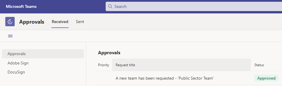 Once submitted, an approval request is sent to an Admin User via an approvals functionality which is surfaced within Teams, as well as the admin’s email. If approved, the Microsoft team is created using the information provided in the form, applying the appropriate team template and EECA governance rules.